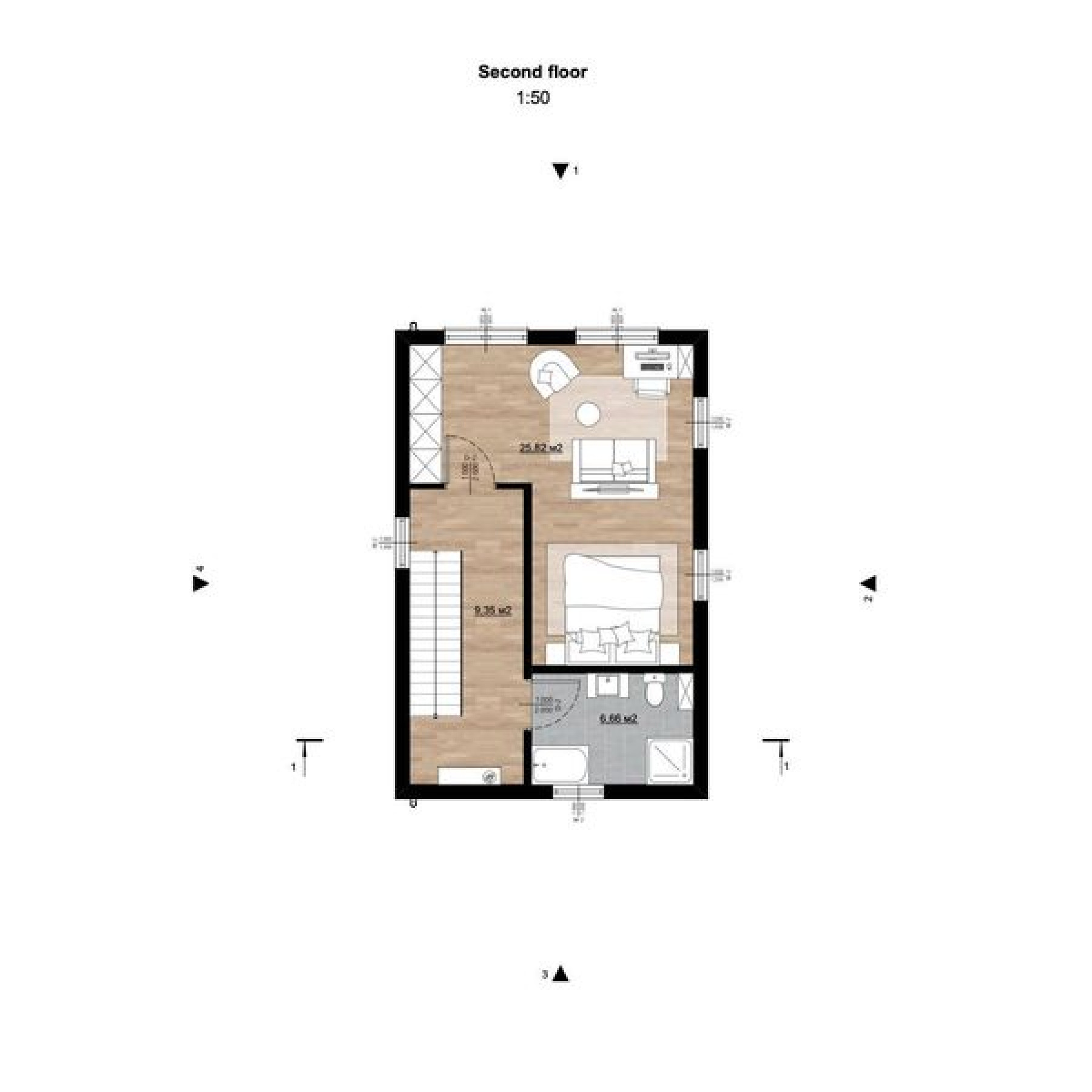 Im Obergeschoss finden Sie das geräumige Schlafzimmer, das sich auch perfekt für ein Arbeitszimmer eignet. Das moderne Badezimmer ist mit einer Dusche und einer Badewanne ausgestattet und bietet genügend Platz für Ihre Bedürfnisse. Im Obergeschoss gibt es ebenfalls insgesamt zwei Räume mit einer Gesamtfläche von 41,83 m².