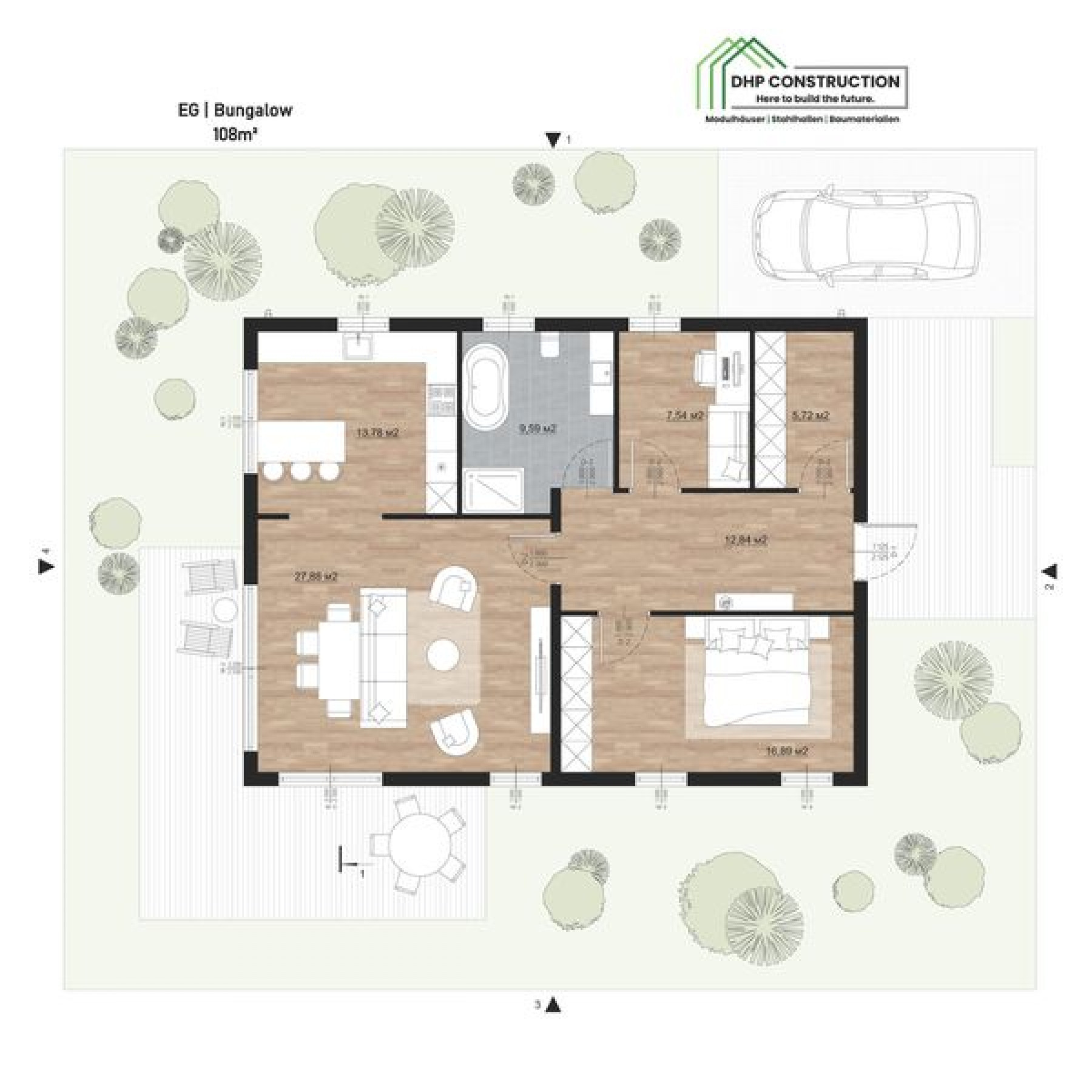 Der Bungalow 108m² ist eine attraktive Immobilie mit einer Nettowohnfläche von 94,35m². Das Haus verfügt über vier Zimmer, darunter einen weitläufigen, lichtdurchfluteten Wohn- und Essbereich mit verbundener Küche, einen geräumigen Flur, einen Hauswirtschaftsraum/Technikraum, ein großzügiges Badezimmer mit genug Platz für Badewanne und Dusche sowie ein Büro.