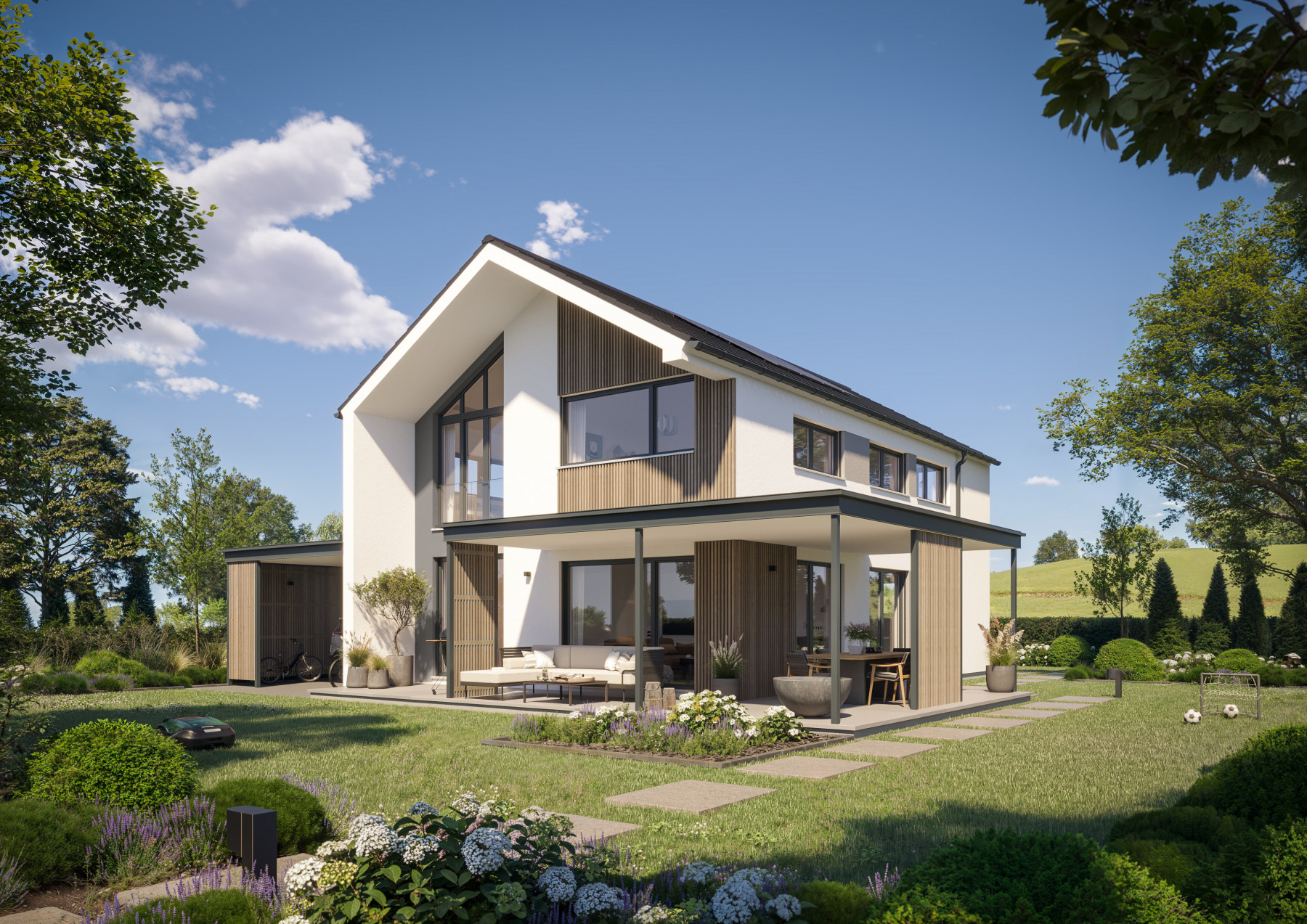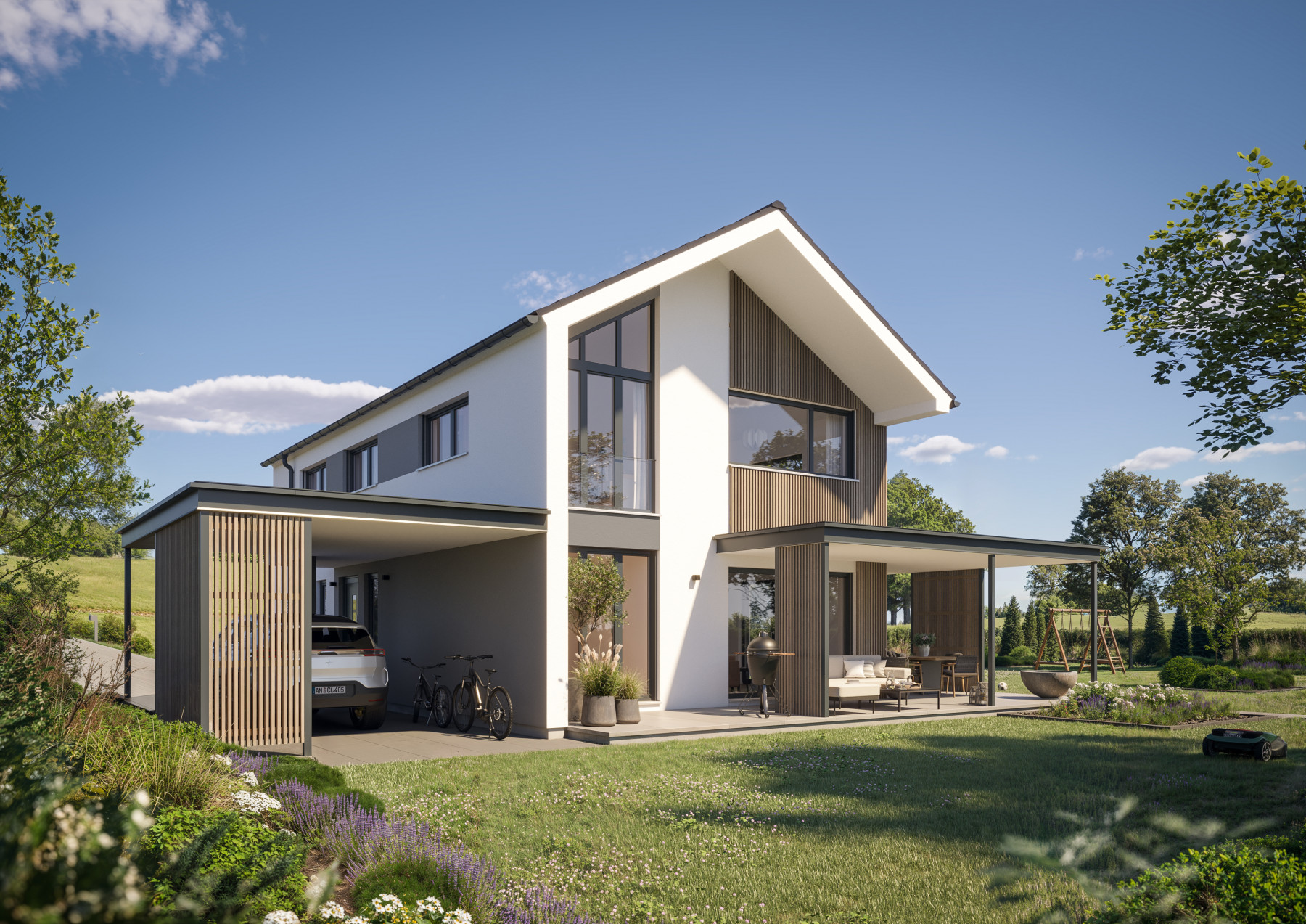 Klare Linien und eine ruhige Architektursprache bilden die Basis für ein Zuhause, das den Familienalltag strukturiert und zugleich Freiraum lässt. Großzügige Zimmer schaffen Platz für Entwicklung und Rückzug, während die Anordnung der Räume ein harmonisches Miteinander unterstützt. Offen gestaltete Wohnbereiche mit fließendem Übergang nach draußen fördern Begegnung, Leichtigkeit und eine Wohnqualität, die mit der Familie mitwächst.