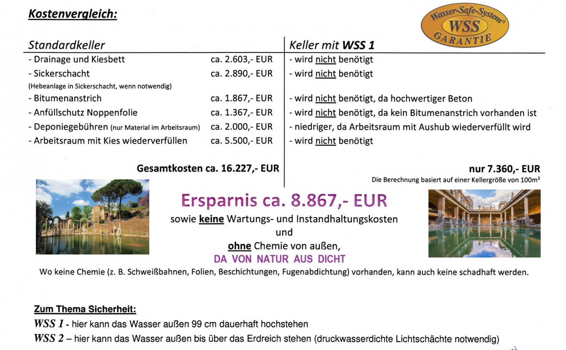 Dieses System "WSS" ist eine naturnahe Bauweise. Es ist damit zu rechnen, dass für die folgenden Generation die Gebäudeerhaltungsmaßnahmen um ein Vielfaches niedriger sein werden. Wer mit der Natur lebt, der lebt gesünder, länger und vor allem stressfreier. MIT ÖKO hat das nichts zu tun sondern mit einem Blick zurück - z.B. in die Baukunst von Wasserbecken vor mehr als 2000 Jahren - heute immer noch dicht - ohne Chemie - dafür aber unter Beachtung der Naturgesetze, die Menschen im Altertum und der Antike bereits erfolgreich vorgemacht haben. Darauf basieren die Grundsätze und Technik des patentierten WASSER-SAFE-SYSTEM.
