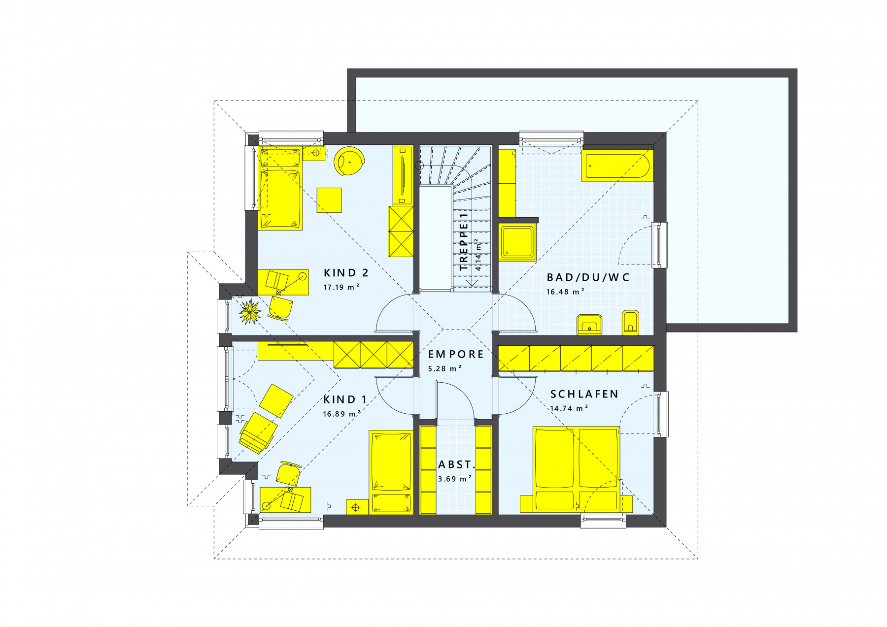 Das SUNSHINE 151 bietet dir die perfekten Lösungen für die unterschiedlichsten Wohnanforderungen. Wenn ihr gerne länger ausgeht oder mit Freunden öfters die Nacht zum Tag macht – am Ende des Tages geht ihr im Erdgeschoss zu Bett, und die Kinder können oben unterm Dach ruhig schlafen. Das Gästezimmer neben den Kinderzimmern lässt sich auch als zusätzliches Spielzimmer nutzen, das das Kinderreich perfekt ergänzt. Dank seiner vier unterschiedlichen Obergeschoss-Varianten eignet sich dieses Haus für große Familien genauso wie für kleine. So könnt ihr auswählen, ob alle Familienmitglieder ihre Schlafzimmer im Obergeschoss haben oder ob ein Teil der Familie unten und der andere oben in bis zu fünf Schlafzimmern wohnt.