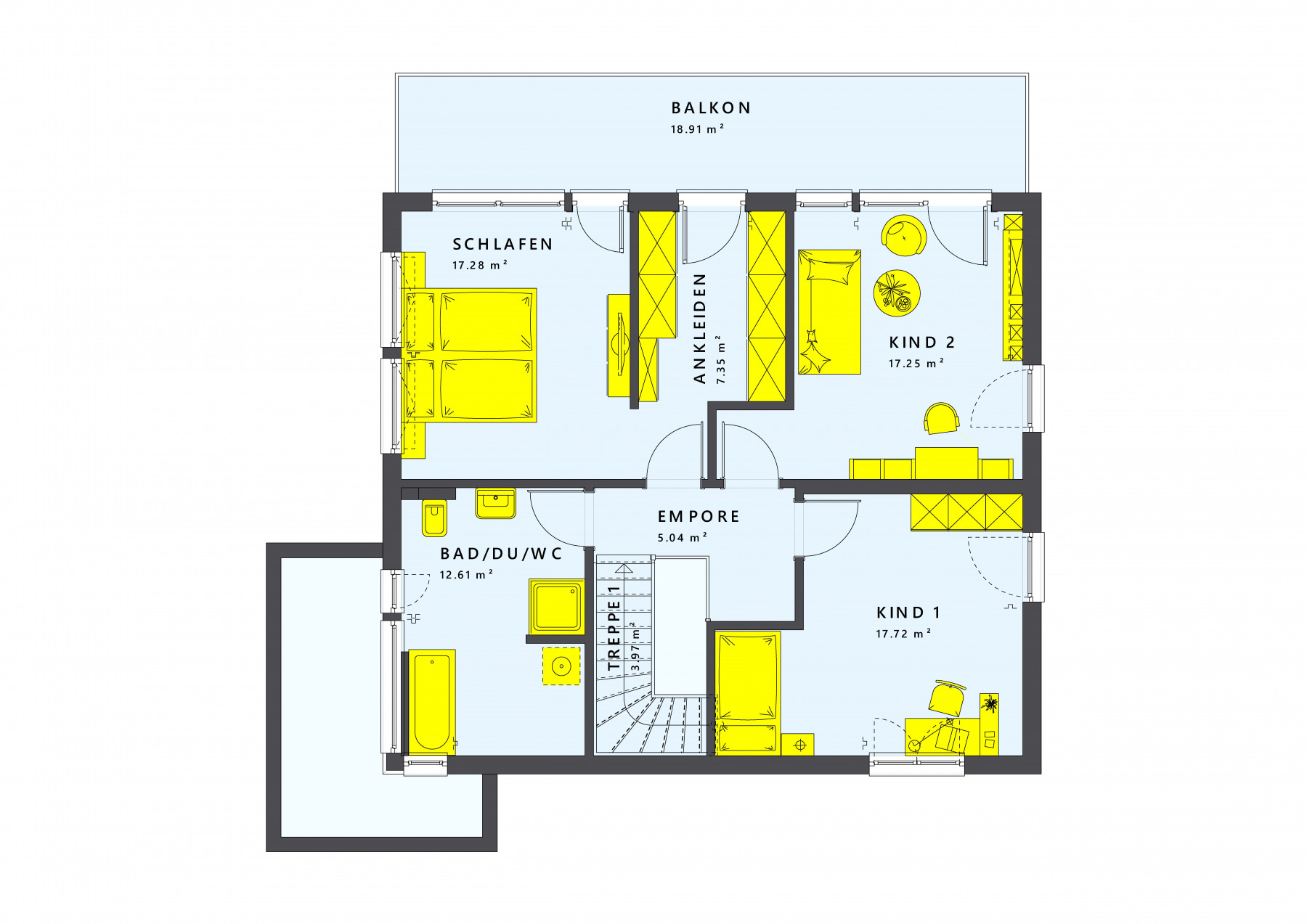 Das elegante Einfamilienhaus SUNSHINE 165 ermöglicht dir mit vielen vorgedachten Detaillösungen eine ganz individuelle architektonische Gestaltung, um deine persönlichen Wünsche und Ideen perfekt umzusetzen. Im Erdgeschoss bietet der Wohn- und Essbereich mit angrenzender Küche viel Platz zum Kochen, gemeinsam Essen, Feste feiern und auch mal die Beine hochlegen. Das zusätzliche Zimmer kannst du ganz nach Bedarf als Hobbyraum, Bibliothek oder Arbeits- und Gästezimmer nutzen. Im Obergeschoss haben die Empore und das integrierte Schlafzimmer einen besonderen Charme und machen dein Leben im SUNSHINE 165 noch ein Stückchen schöner.