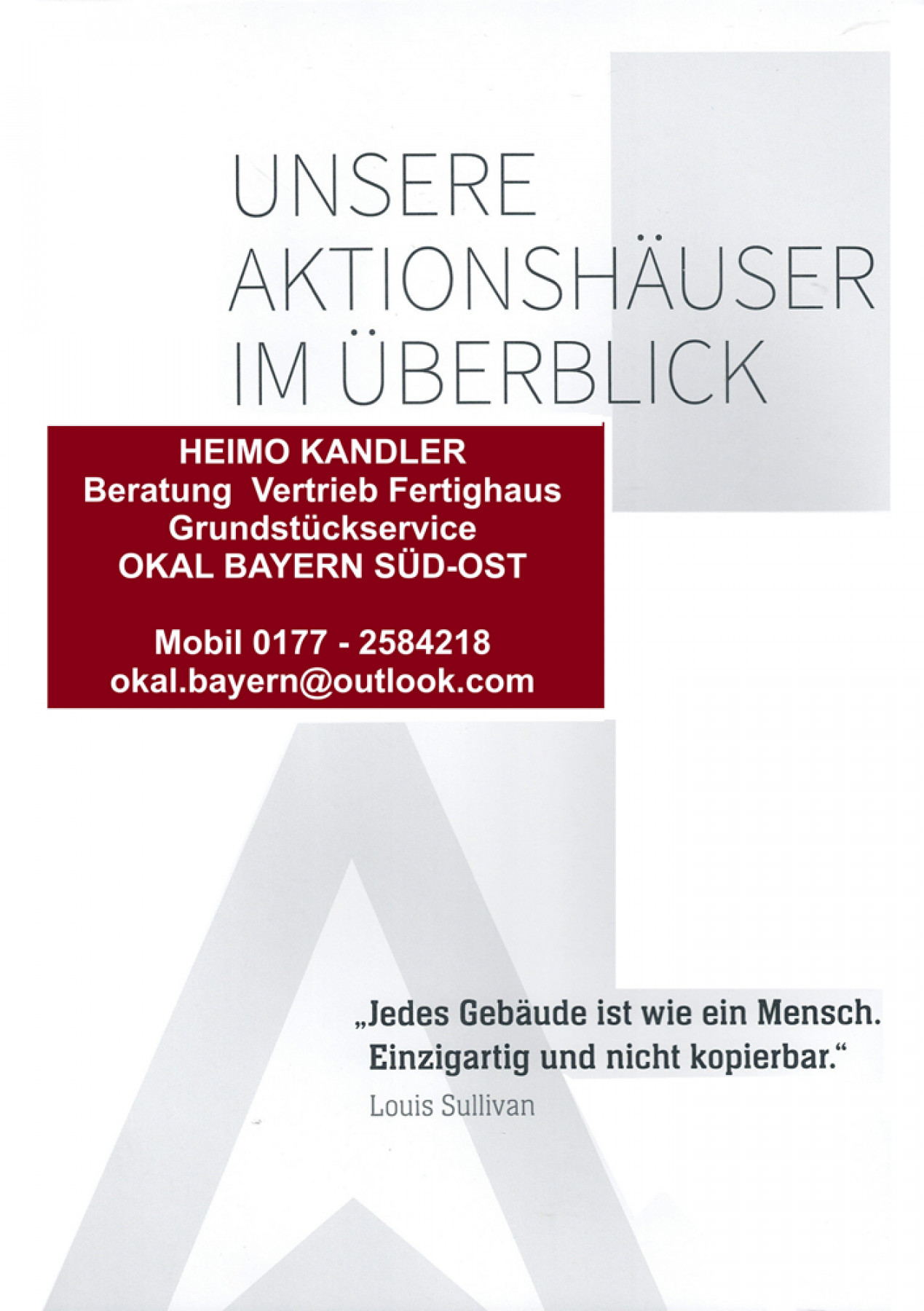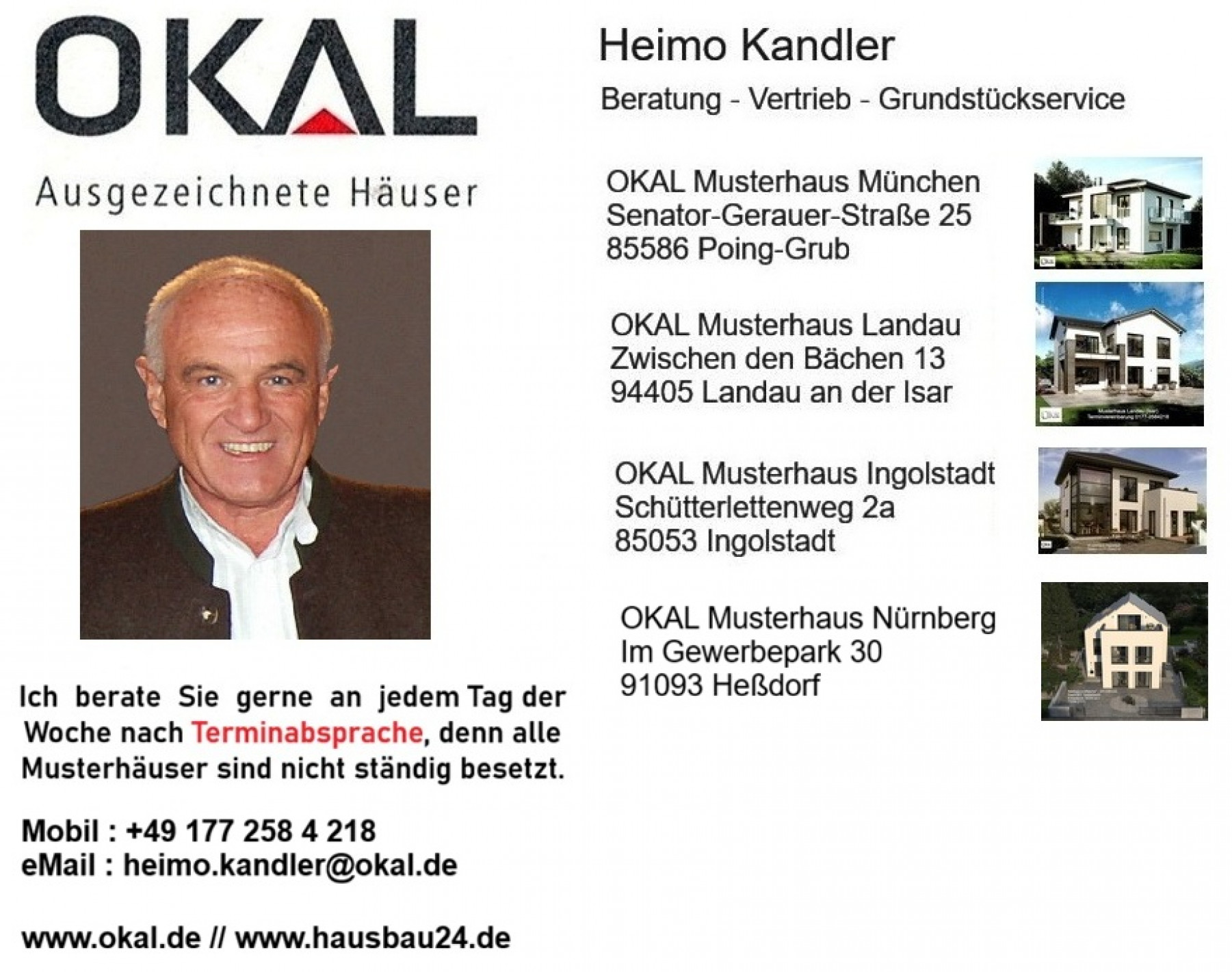 Gerne können Sie mit mir auch einen persönlichen Termin vereinbaren, um ganz in Ruhe über Ihr geplantes Bauvorhaben zu plaudern oder auch konkret zu sprechen. Dafür bieten sich unsere Musterhäuser mit Büro in der Region Oberbayern, Niederbayern und Schwaben an: