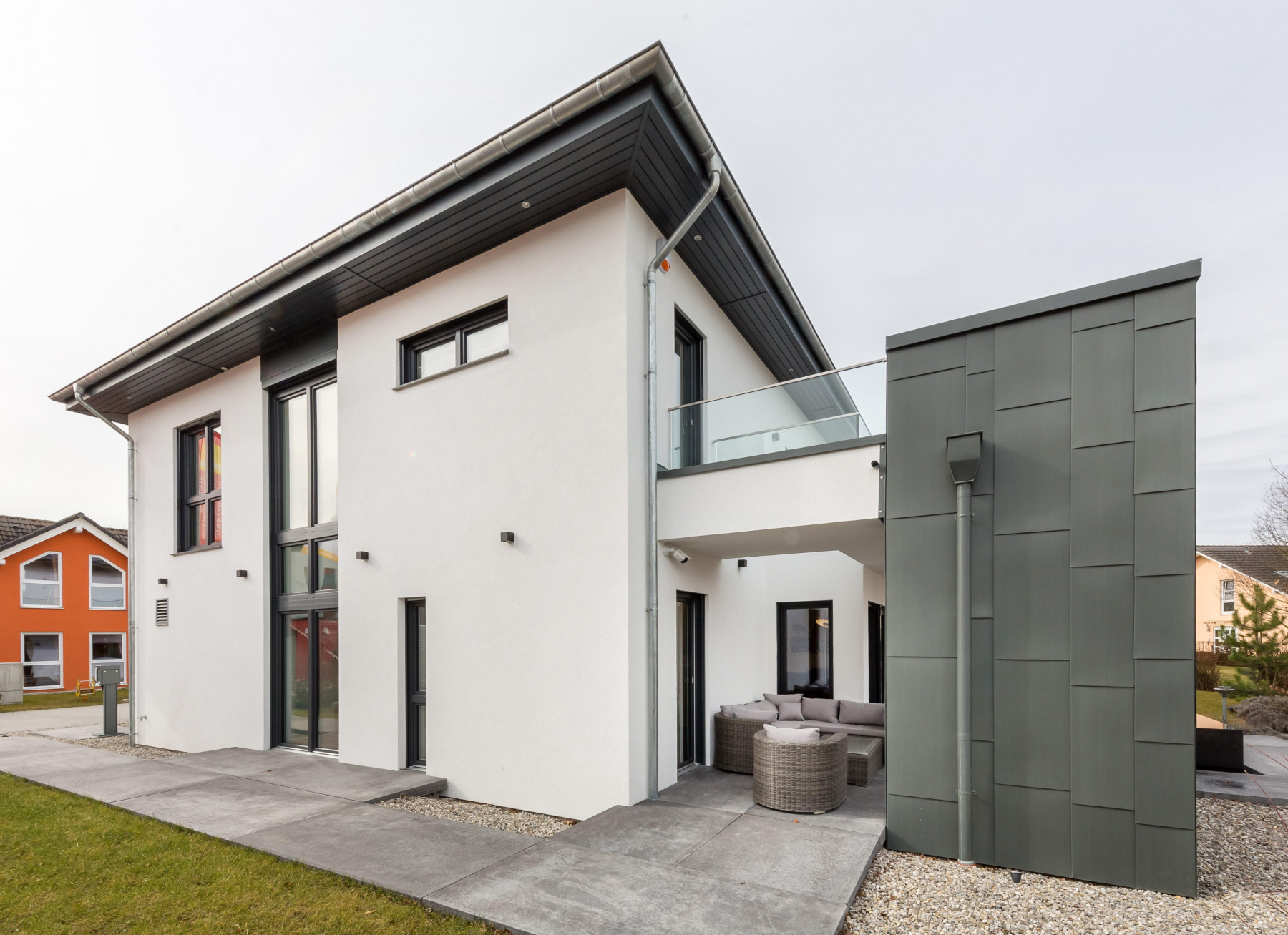Auch für kleine Grundstücke ist dieses Haus bestens geeignet und überzeug das schicke Stadthaus durch perfekte Raumaufteilung, die keine Wünsche offen lässt. Der licht- und raumspendende Erkeranbau verleiht dem kubischen Baustil zusätzlichen Charm. Für alle Naturliebhaber gibt es zwei Balkone sowie die große und teilweise überdachte Eckterrasse.. Diese ermöglicht ganzjährig den Weg nach draußen. Die stützenden Wandscheiben setzen architektonische Akzente und bieten Wind- und Wetterschutz. Und auch für den Innenbereich gilt - Typisch OKAL - durchdacht und geplant.