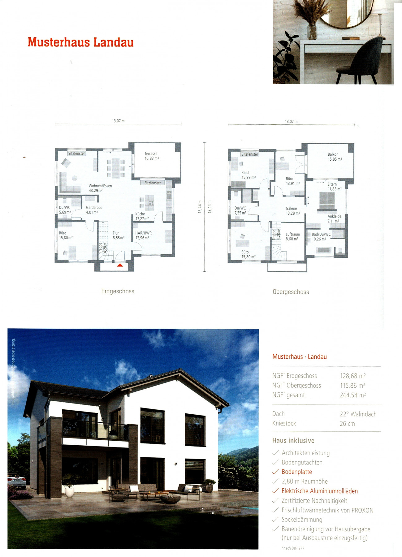 Zeitlose Eleganz gepaart mit zahlreichen kleinen und großen Details, die das Wohnen angenehmer, noch schöner, noch komfortabler machen - das zeichnet das Musterhaus Landau aus. Die zeitlose Eleganz wird bereits in der Fassade sichtbar. Der Grundriss unter dem Satteldach ist so konzipiert, das dank eines Rückversatzes im ersten OG ein Balkon zum Verweilen und entspannen einlädt, während darunter ein überdachter Terrassenbereich entsteht. Große Fensterflächen lockern die Fassade auf. Sie sorgen im Innenbereich für maximalen Lichteinfall. Es erwarten Sie in diesem Innenbereich 245 m² mit einer durchdachten Raumplanung. Die Diele geht unmittelbar in den Wohn-Ess-Kochbereich über. Weil die Schiebetüren direkt in den Garten führen, entsteht ein Gefühl von Weite. Natur und Wohnen verschmelzen miteinander.