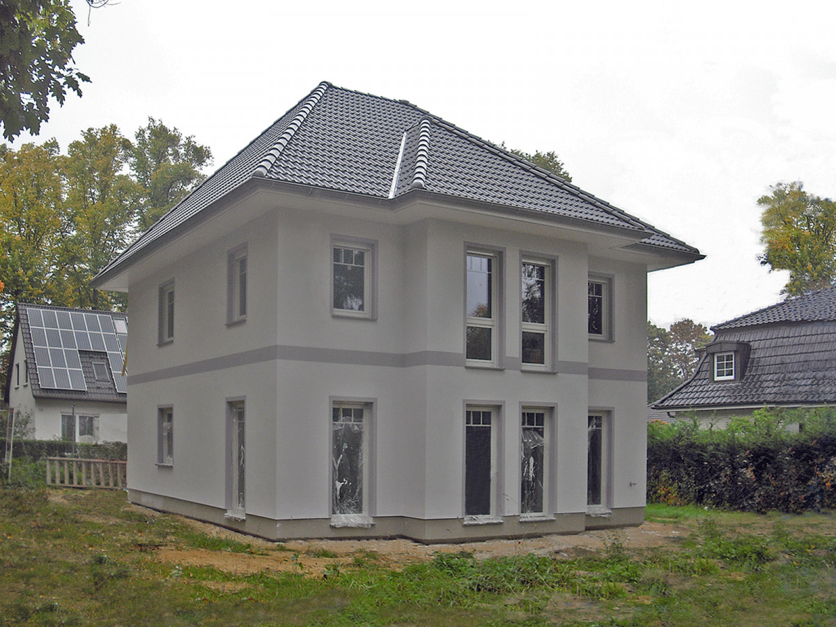 Die Stadtvilla mit Putzfassade und Walmdach spricht Liebhaber von Klarheit an. Der Entwurf ist zeitlos und zugleich äußerst überlegt auf die Bedürfnisse von zwei Parteien zugeschnitten. Ins Auge fällt die abgewalmte Eingangsüberdachung auf zwei Rundstützen. Farblich abgesetzten Faschen, Laibungen und eine umlaufende Bauchbinde akzentuieren die helle Putzfassade.