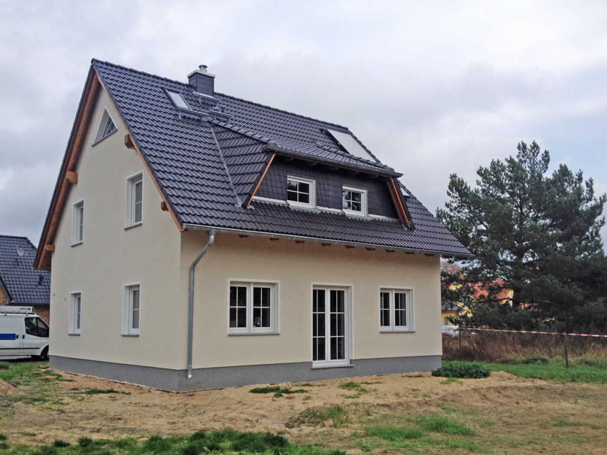 Charakteristisch für den Landhausstil sind Details mit Bezug zu regionalen Bautraditionen. Hier sind es beispielsweise der als Zwerchhaus ausgeführte Eingangsbereich, zwei Dreieckfenster in den Spitzbodengiebeln, eine große Trapezgaube zur Gartenseite und die werthaltige Klinkerfassade.