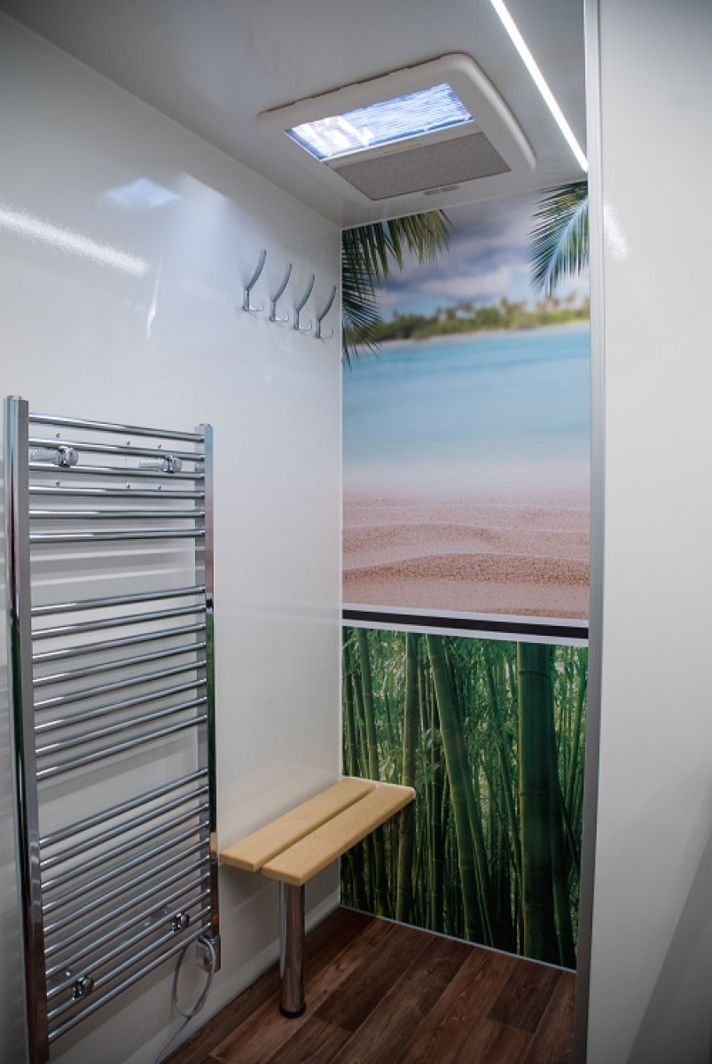 Das mobile Badezimmer „mobibad“ verfügt über alles, was man von einem Bad erwartet: Toilette, Waschbecken, geräumige Dusche und eine elektrischer Fußbodenheizung,
