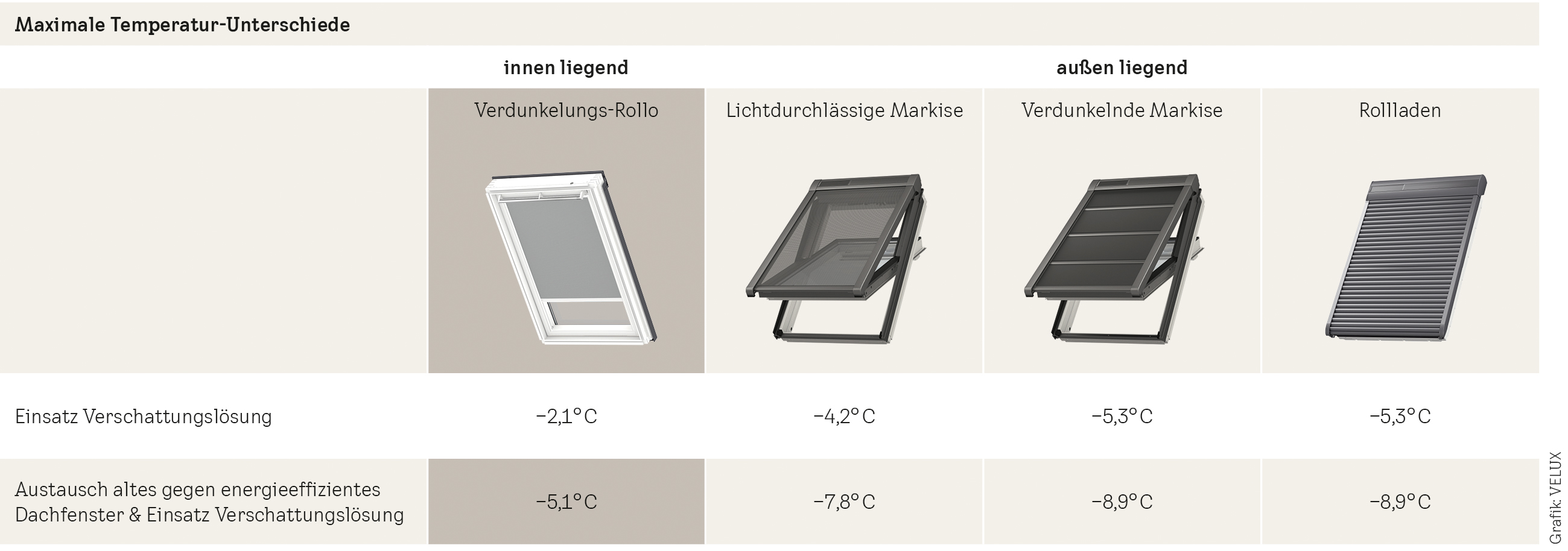 Bei Austausch eines alten Dachfensters und Einsatz eines Rollladens fast 9 Grad Celsius niedrigere Temperaturen möglich