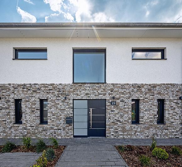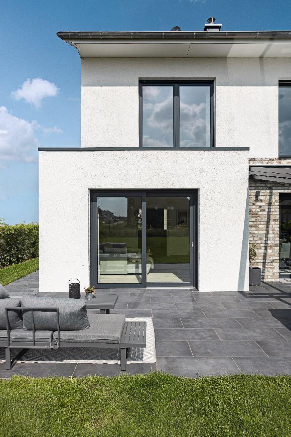 Mit einem besonders schlanken Überschlag von nur 9 mm, außen anthrazit glatt und innen weiß, verleihen die Fensterprofile von Elegant Infinity 76 der Hausfassade einen modern-minimalistischen Look, von Alu-Rahmen optisch kaum zu unterscheiden. Gleichzeitig verfügen sie aber über die hohen Wärmedämmwerte einer PVC-Rahmenkonstruktion, in diesem Fall bis zu Uf von 0,93 W/m2K. Und schließlich erlaubt eine spezielle Klebetechnologie besonders große und stabile Fenster und somit lichtdurchflutete, helle Räume, was dem Hausherrn besonders am Herzen lag.