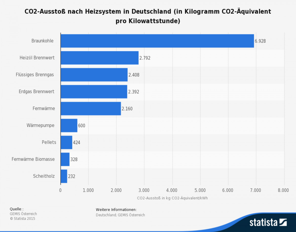 Braunkohle ist am umweltschädlichsten, denn laut einer Erhebung der GEMIS Österreich (siehe Infografik; Quelle: Statistik-Portal de.statista.com) setzt der fossile Brennstoff bis zu 7.000 kg CO2-Äquivalent pro Kilowattstunde an erzeugter Wärme frei. Bei Heizöl sieht der Brennwert schon besser aus, liegt aber mit knapp 2.800 kg / kWh immer noch vor dem von Gas und den Pellets.