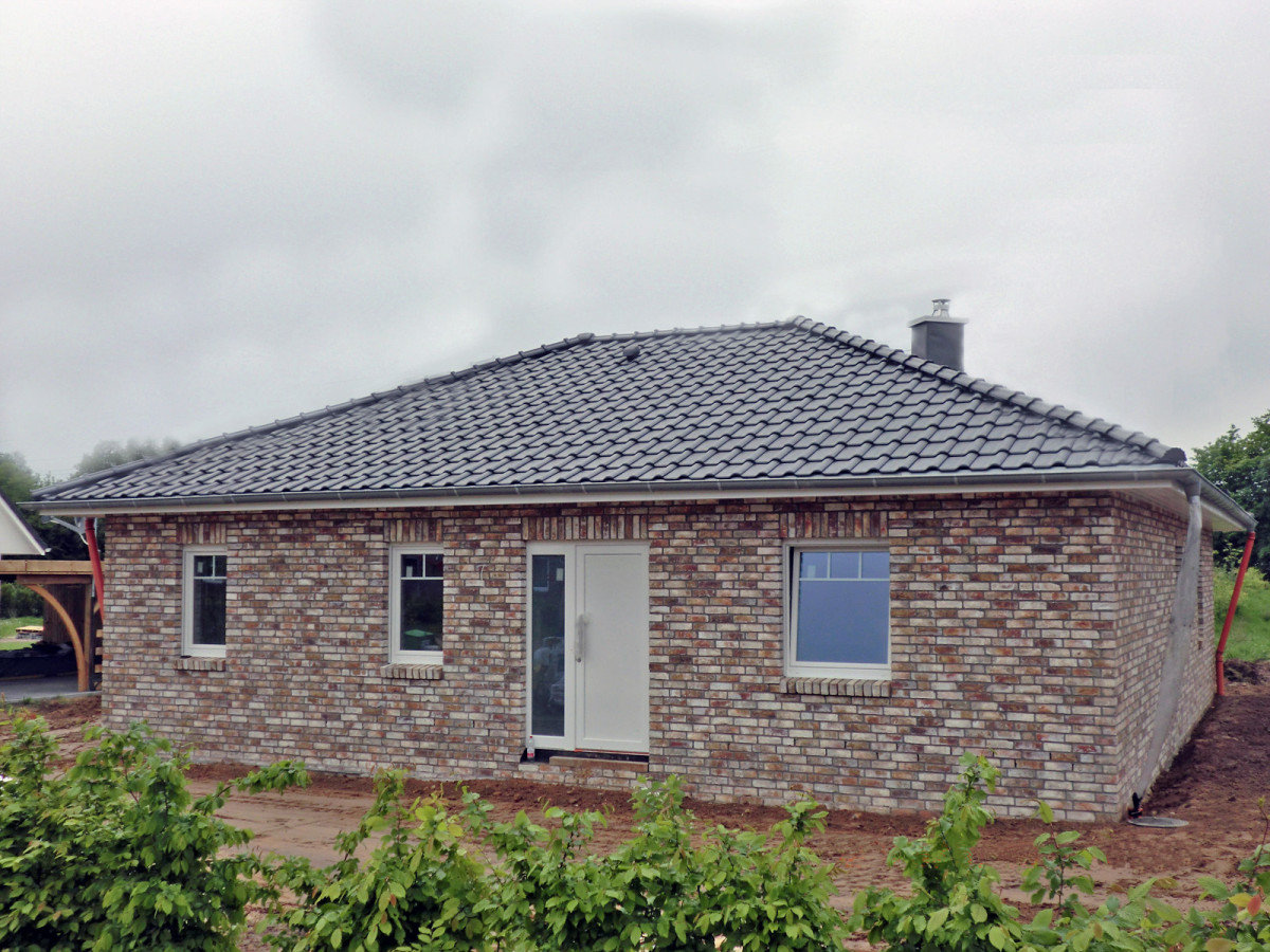 Die Fassade des Bungalows in Basdorf erhielt ein markantes Verblendmauerwerk aus Klinker. Ein Walmdach löst die klassische Bungalowoptik auf.