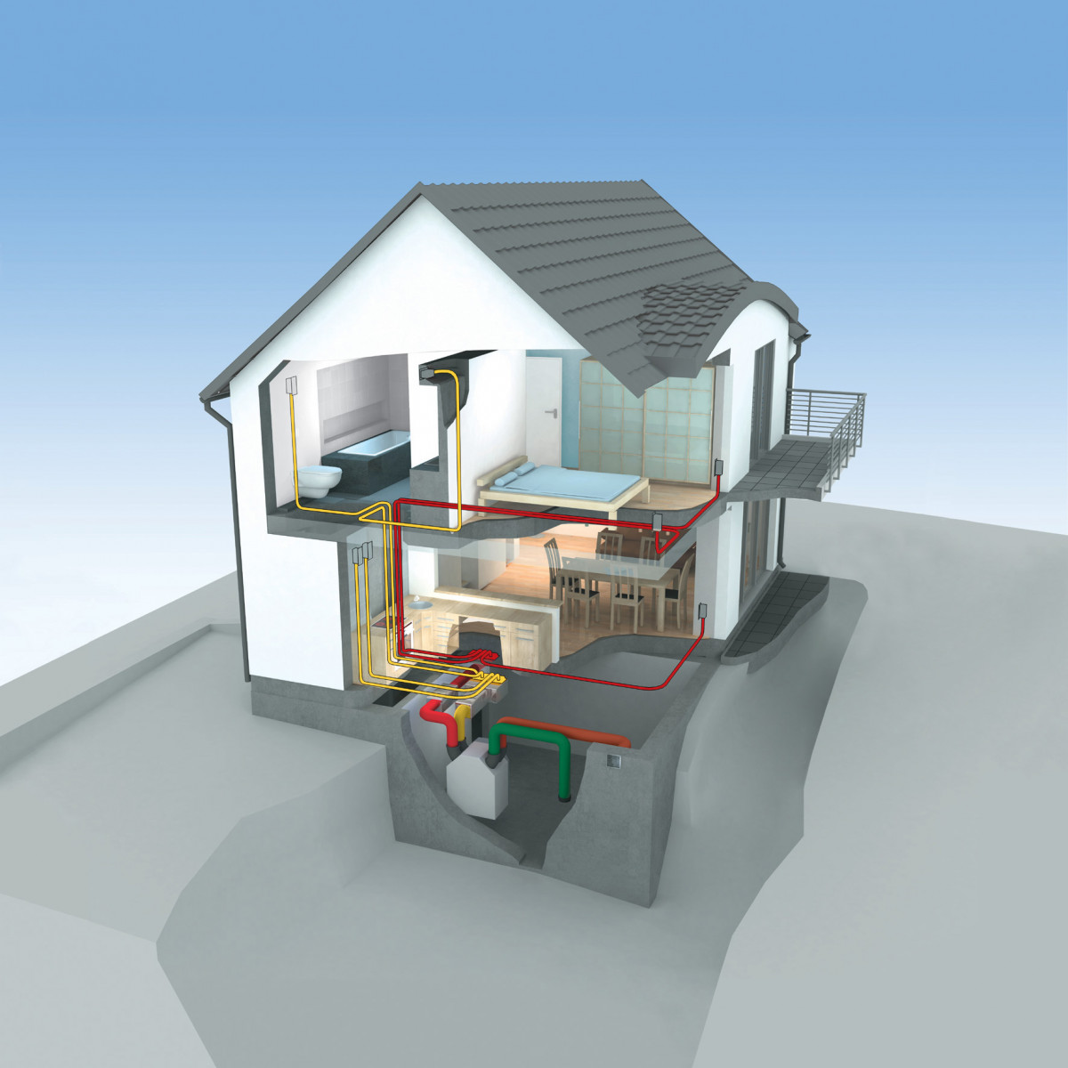 Um ein optimales Innenraumklima zu gewährleisten, verfügen die Fertighäuser von Schwabenhaus standardmäßig über eine kontrollierte Be- und Entlüftungsanlage mit Wärmerückgewinnung, die für eine kontinuierliche Frischluftzufuhr sorgt. Auch ohne die Fenster zu öffnen, wird dabei alle drei Stunden die gesamte Luft im Haus ausgetauscht. Ein Pluspunkt für Allergiker: Der optional integrierbare Staub- und Pollenfilter reinigt die Luft und schützt sie so zuhause vor lästigen Allergiesymptomen. Die speziell für Niedertemperatur-Heizungssysteme entwickelte Fußbodenheizung verteilt die Wärme optimal im Raum, ohne Staub und andere Schmutzpartikel aufzuwirbeln.