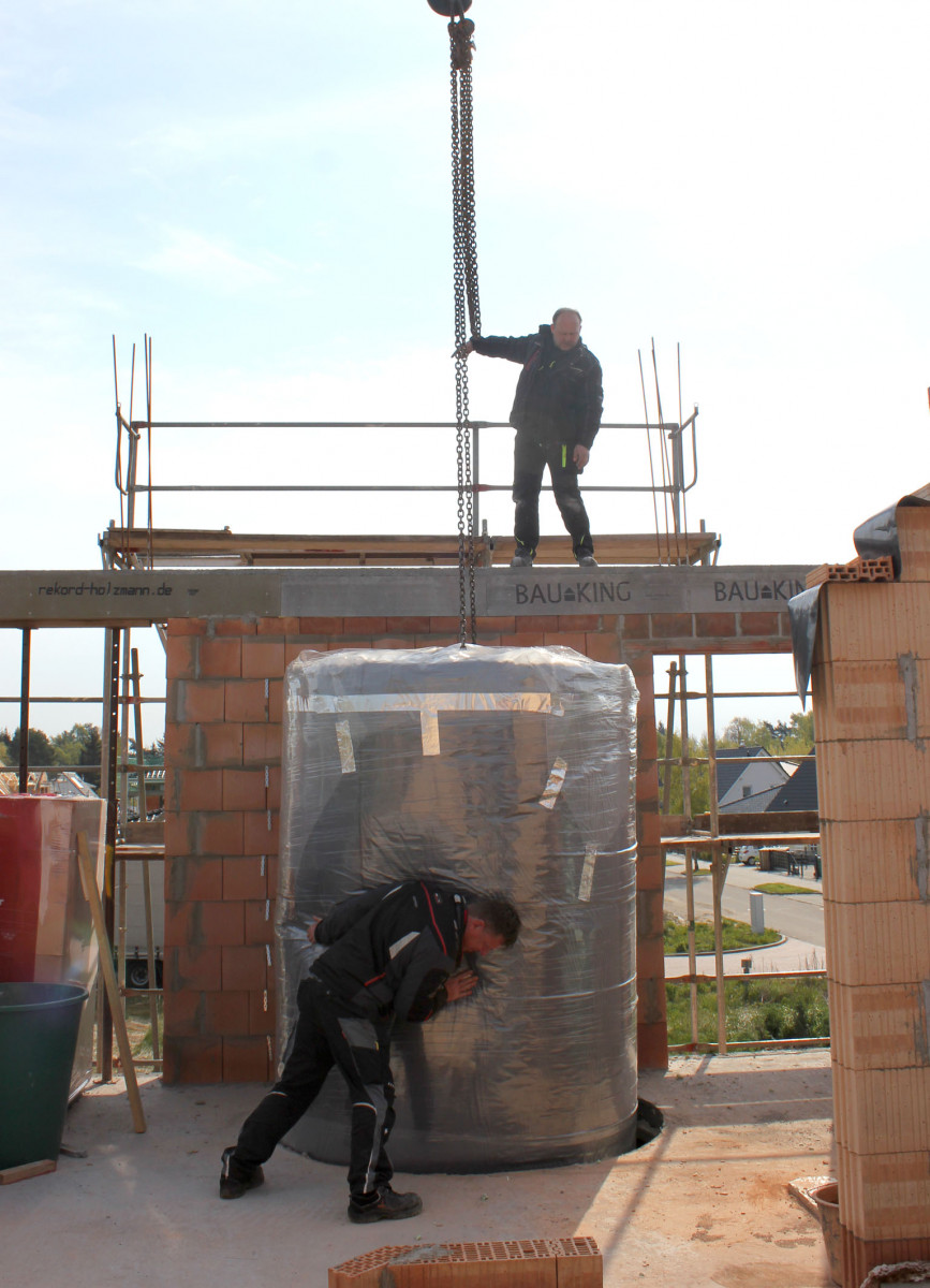 Was da am Ausleger des Krans hängend heranschwebt, ist ein mehr als eine Tonne schwerer Solarspeicher auf dem Weg in sein künftiges Zuhause, ein Einfamilienhaus in Mahlow. Noch fehlt dem Rohbau das Dach, denn erst wenn der stählerne Koloss fest verankert ist, können die Arbeiten am Obergeschoss weitergehen. Über zwei Etagen erstreckt sich der fast fünf Meter hohe Pufferspeicher, der von einer Fachfirma aus Sachsen montiert wird. Mit seinem Fassungsvermögen von über 7 000 Litern bildet er das Herzstück des Heizsystems für ein Sonnenhaus – errichtet von der HELMA Eigenheimbau AG.